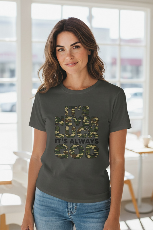 Faith Camo T-Shirt — "It's Never Luck It's Always God" Graphic Tee
