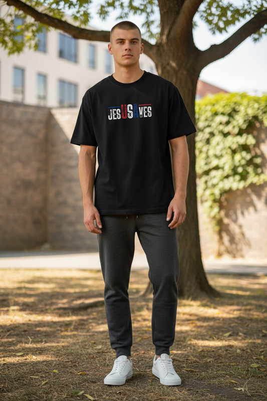 USA Jesus Saves Flag T‑Shirt — Red & Blue Vintage Lettering