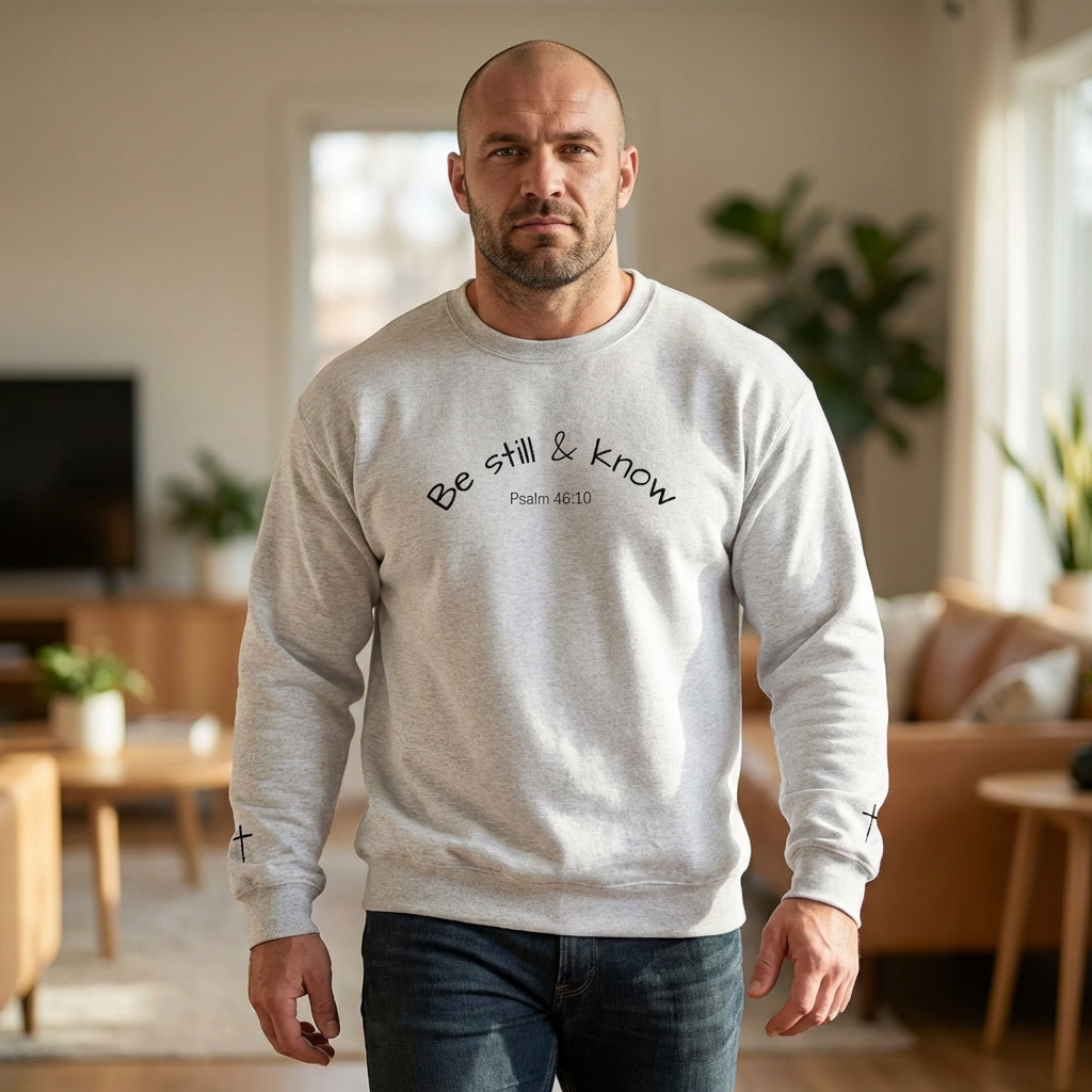 This embroidered crewneck sweatshirt carries a quiet, grounding presence. The delicate “be still and know” script sits alongside a double-sleeve cross motif, stitched with care so the message feels woven into the fabric of your day. It settles over shoulders with a classic, clean silhouette — warm enough for cool morning prayers, gentle evening walks, or slow coffee and reflection. The tubular knit and ribbed collar keep its shape through repeated wear, while soft, midweight fabric hugs without heaviness. Wear it layered with a flannel on retreat weekends, or solo during a reflective moment at home. The handcrafted embroidery and understated crosses speak to someone who values calm, faith, and garments that quietly last.
